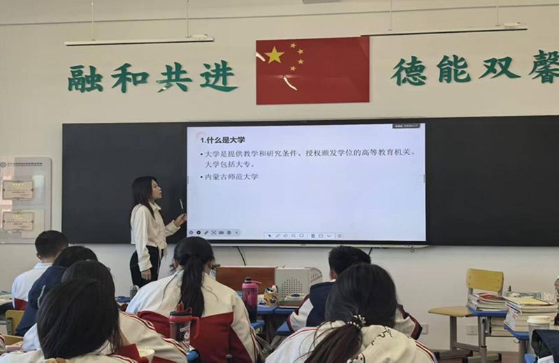 “ 我们的第一堂班会,主题为‘什么是大学’。虽然提前熬了三个晚上打磨PPT,站在讲台上时还是忍不住手心出汗。当我指着屏幕上‘大学是提供教学和研究条件的高等教育机关 ’这句话开口时,声音里的紧张连自己都能察觉。但台下学生们专注的眼神,像一束光稳住了我——我开始试着把‘大学’讲成他们能听懂的憧憬,讲内蒙古师范大学的校园,讲未来的可能性……”